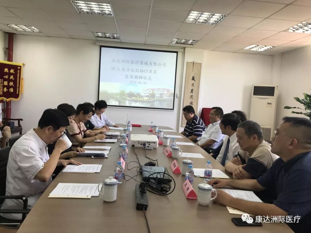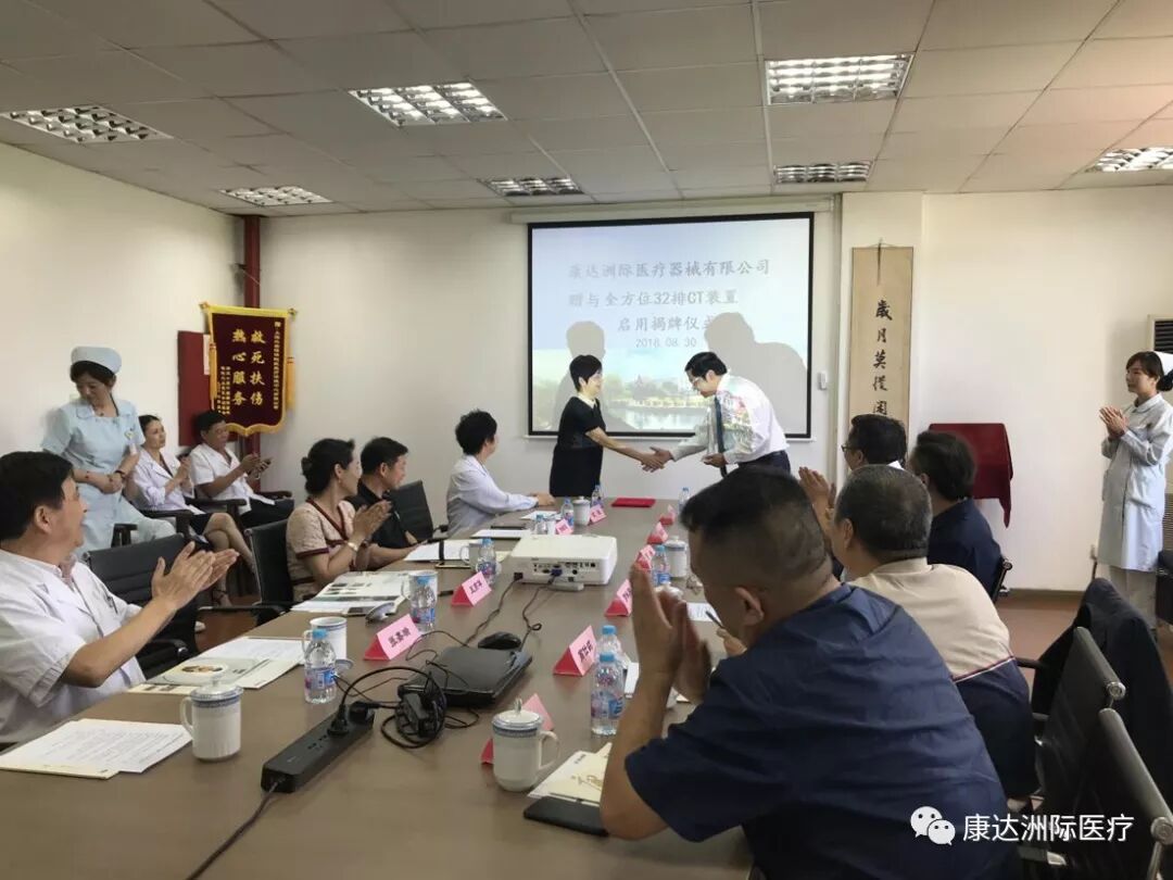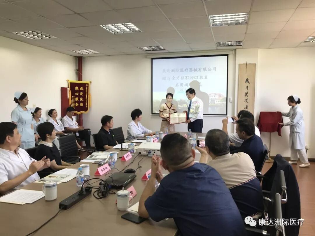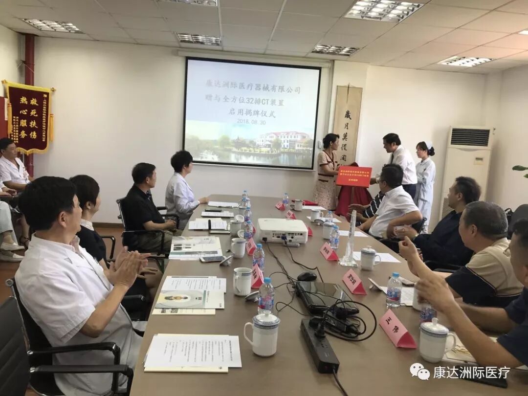 上海外高桥集团股份有限公司行政总监、上海外高桥保税区医疗保健中心有限公司董事长王燕华女士,康达洲际董事长郭咏阳先生,中国(上海)自由贸易试验区外高桥保税区办事处主任杜燕英女士在会议上分别发言。上海外高桥集团股份有限公司行政总监王燕华向康达公司董事长郭咏阳赠与纪念品。杜燕英主任向郭咏阳先生颁发荣誉证书并共同揭牌。与会人员一同现场参观了康达洲际赠与的全方位32排CT。